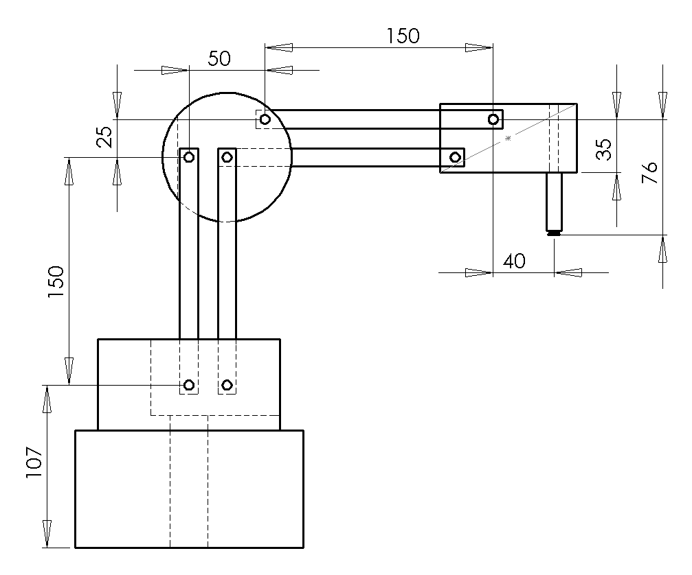 Dobot Magician Lites link length are 150mm each and has a X axis offset of 50 and no Z axis offset since the Z axis is measurement of the servo motor and not the TCP. Important to note the limitation of joints Alt text